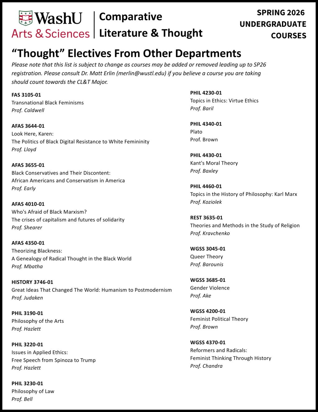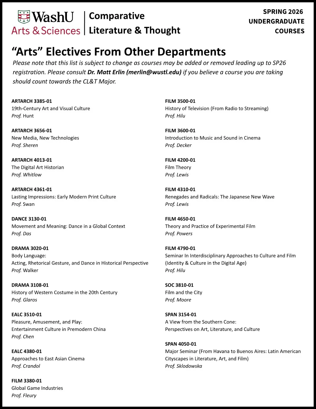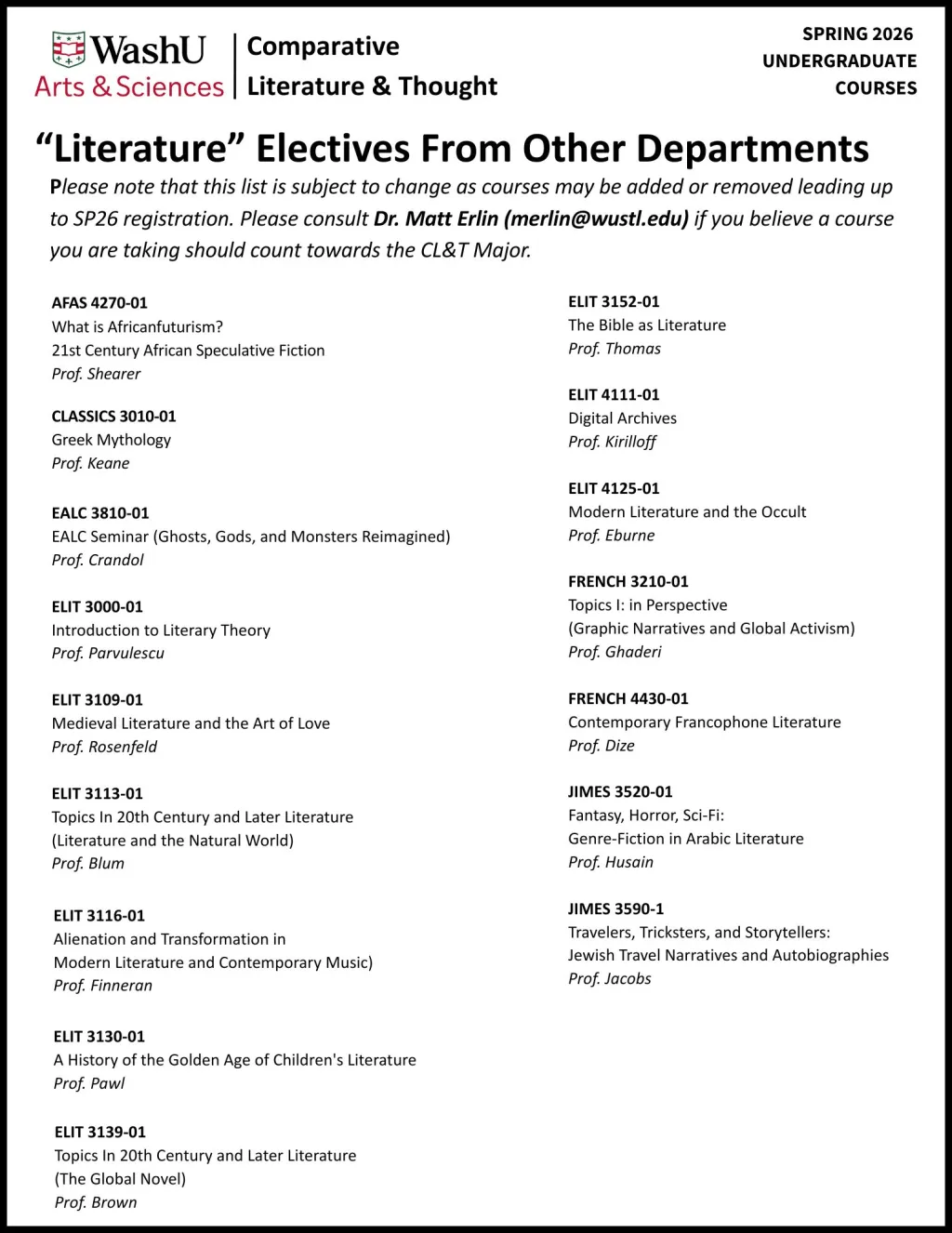 Comparative Literature & Thought embraces a multidisciplinary approach to spark intellectual curiosity within our students. As such, we encourage students to take humanities courses offered by other departments in addition to the ones home-based in Comparative Literature & Thought.